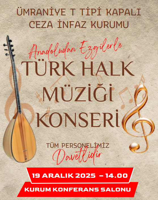 Ümraniye T Tipi Kapalı Ceza İnfaz Kurumu 19 Aralık Cuma Günü bir ilke imza atarak tamamı memurlardan oluşan hiçbir profesyonel destek almadan kendi imkanları ile kurduğu müzik grubu ile bir halk müziği konserine ev sahipliği yaptı. Kurumumuz memurlarının moral ve motivasyonunu arttırmak için yapılan etkinlik büyük teveccüh aldı.